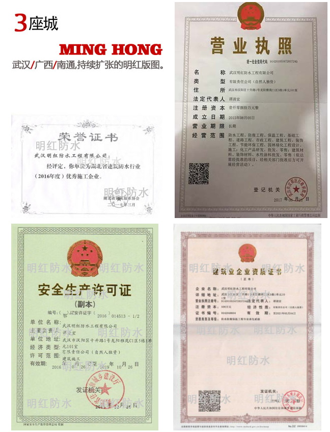 公司以一流的防水材料,精湛的施工技術(shù),誠信讓客戶滿意的服務(wù),能用心把我們的防水專業(yè)做好、做優(yōu)、做大、做強(qiáng)!打造出武漢明紅防水名優(yōu)品質(zhì)的實(shí)在企業(yè) 現(xiàn)公司主要防水維保服務(wù)單位有漢口學(xué)院、武漢國博會(huì)展中心、武漢金馬凱旋CBD、武漢城管督察總隊(duì)、武漢林駿汽車飾件有限公司、關(guān)谷智能網(wǎng)聯(lián)產(chǎn)業(yè)研發(fā)生產(chǎn)基地等單位和企業(yè)。 等單位和企業(yè)。